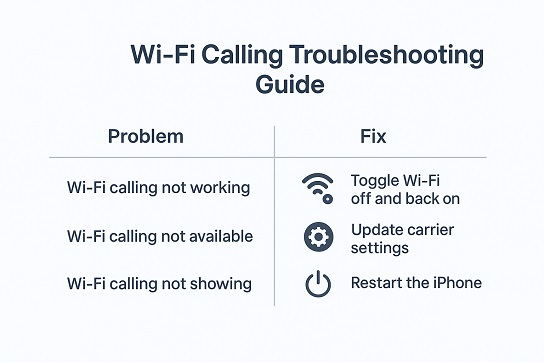 Problem: Wi-Fi Calling toggle missing → Fix: Update iOS or confirm carrier support